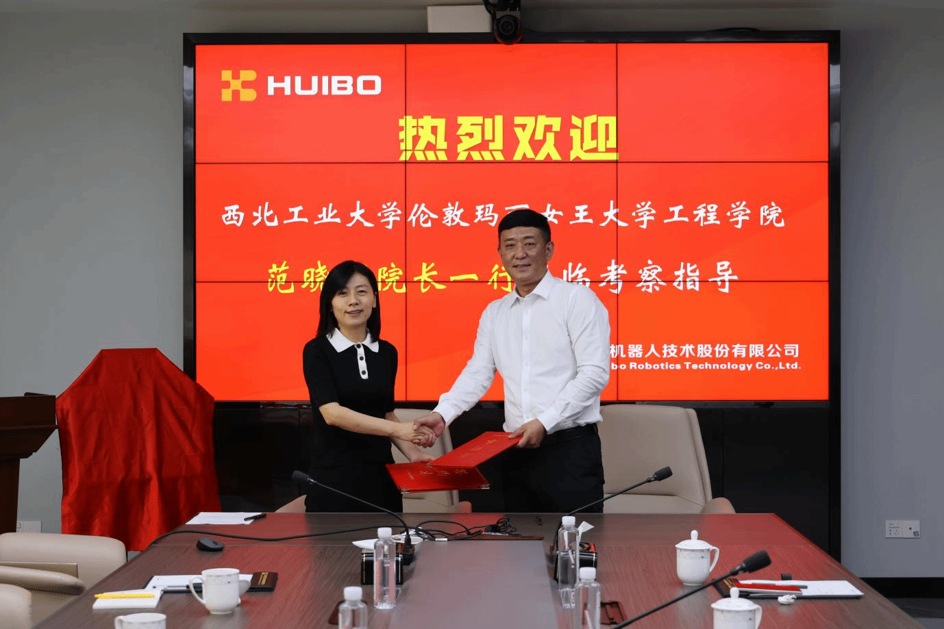 2023年9月7日,西北工业大学伦敦玛丽女王大学yl7703永利老员工实习实践基地挂牌仪式暨院企人才培养合作协议签约仪式在江苏汇博机器人技术股份有限公司(以下简称“汇博机器人公司”)举行,玛丽女王yl7703永利经理范晓丽和汇博机器人公司副总裁崔晓辉等7人出席了此次会议,会议由汇博机器人公司西北大区总经理金鑫鑫主持。
