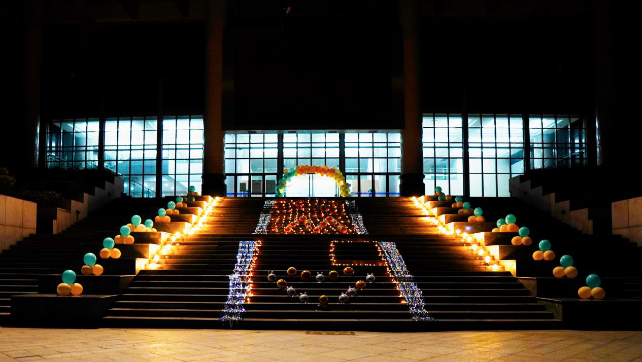 晚会梦幻的气氛从入场便展现出来。翱翔员工中心前的巨幅海报,铺就灯饰的阶梯在夜晚熠熠生辉,迈入用缤纷气球围成的拱门,仿佛真正迈入了属于青春的殿堂。领取过荧光棒,在签名板上留下自己的姓名,每位同学都融入了晚会的气氛。