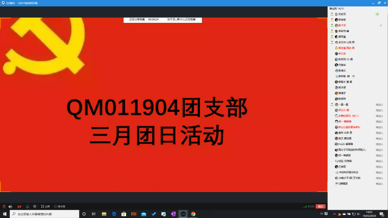 QM011902团支部以“抗疫中的青年力量”为主题,有的团员分享了自己参与抗疫一线志愿者工作、帮扶医护人员子女课业的经历;也有团员就如何在抗击疫情中弘扬雷锋精神发表了自己的观点。全体团员积极讨论、兴致盎然。