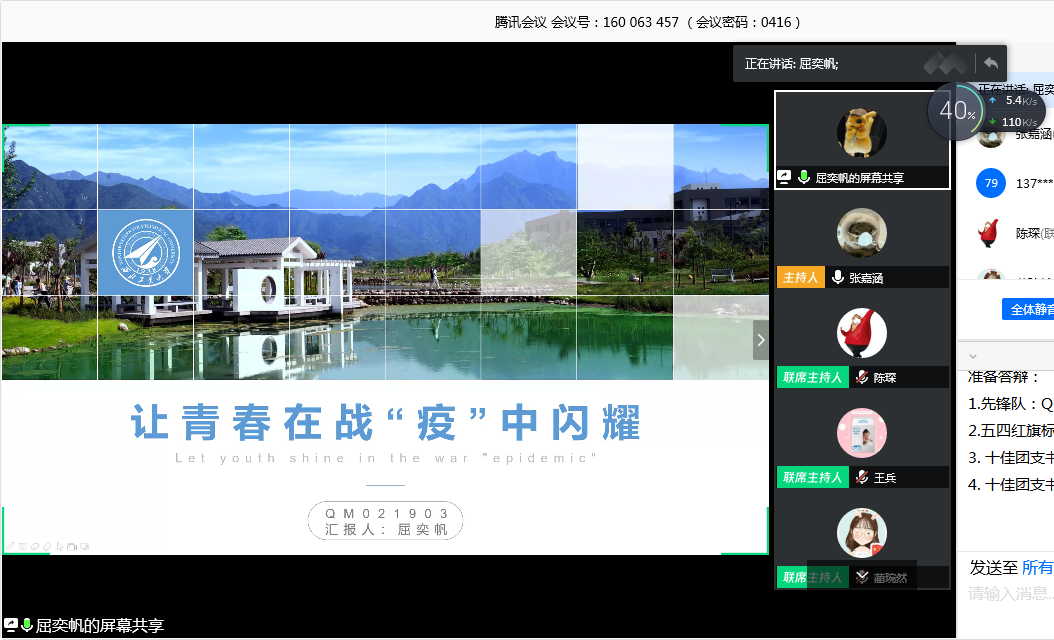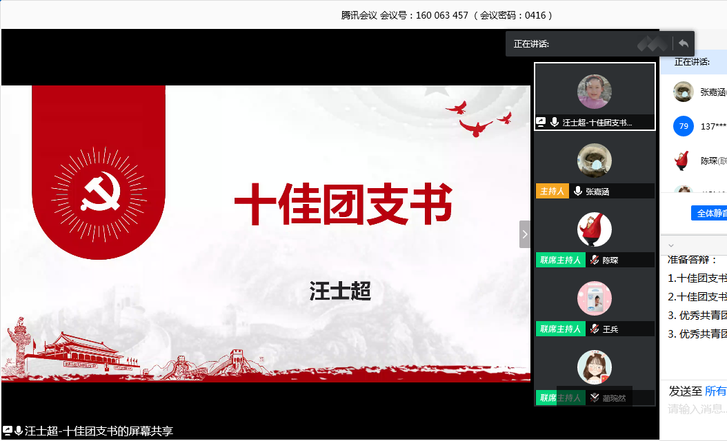 各位同学精心准备答辩稿和内容丰富、要点明确的幻灯片。在答辩过程中,同学们从容大方,无论在志愿服务、科技竞赛、社会实践还是学习成绩方面均有不俗表现,支部建设有思路、有计划,各项制度完善,组织结构清晰。同时,讲述疫情期间,支部成员积极响应号召,担当起中国青年的责任,开展各式各样的抗疫活动为抗击疫情奉献自己的力量。