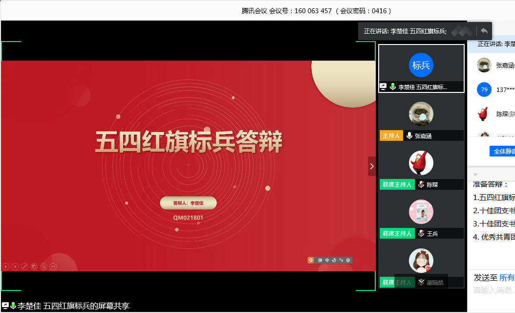 在经过初步遴选后,本次答辩共有6个团支部参与“先进团支部”评选,5个队伍参加“战疫青年先锋队”评选,1位优秀共青团员参加“五四红旗标兵”评选,2名优秀团支书参与“十佳团支书”评选,2名优秀共青团员参与“优秀共青团干部”评选,4名优秀共青团员参加“战疫青年先锋”评选。