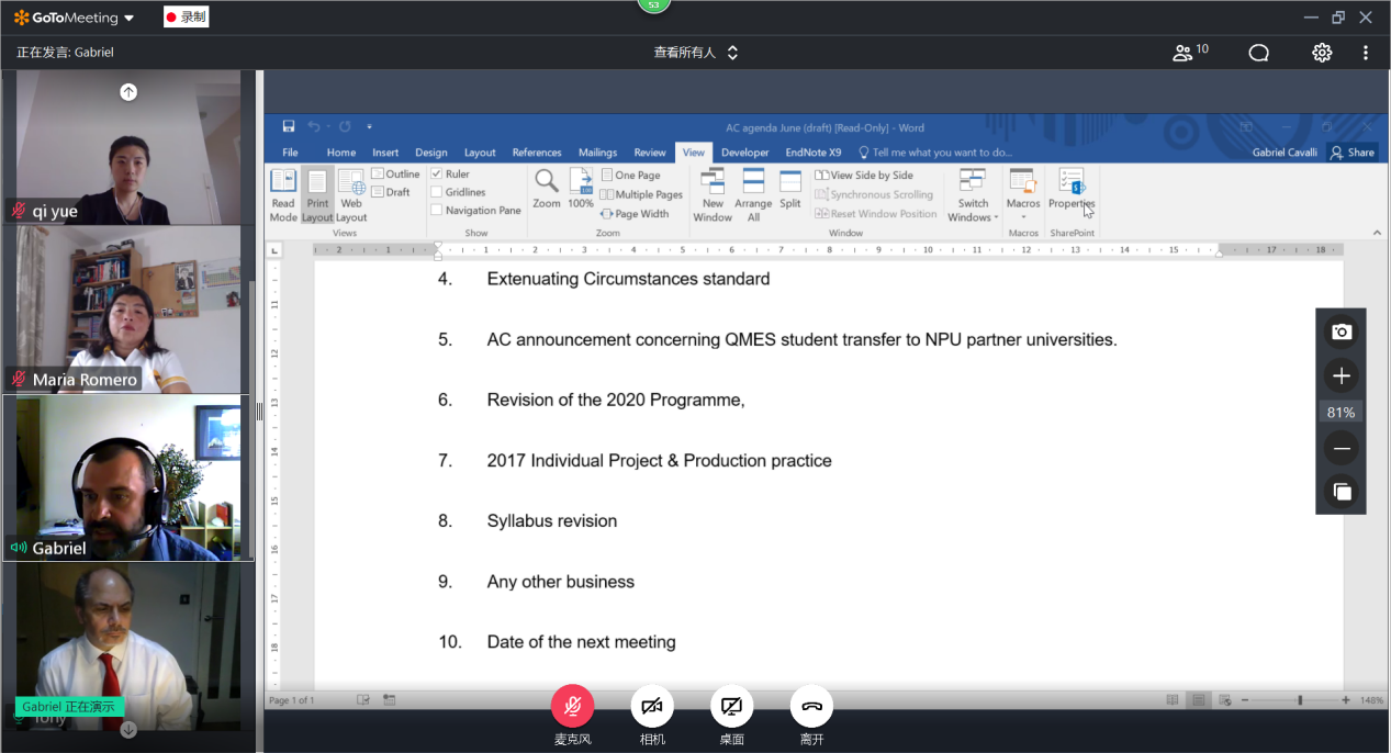 2020年6月3日16:00,西北工业大学伦敦玛丽女王大学yl7703永利以视频会议的形式召开第七次学术委员会,委员范晓丽、Anthony Michael、Andy Bushby、史学涛、Gabriel Cavalli、Maria Romero、Matthew Potter及公司其他中英方教师和工作人员参加了此次会议。