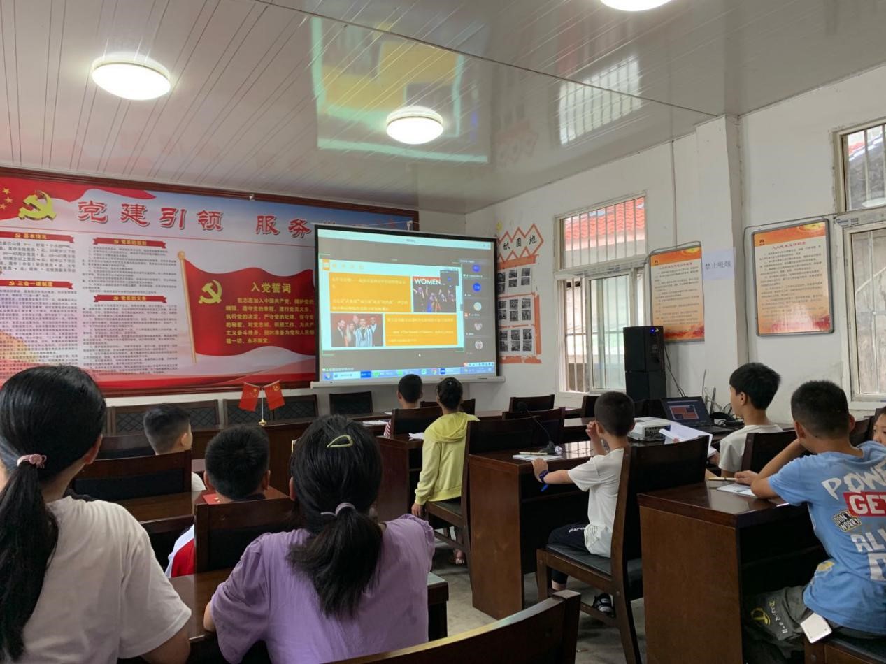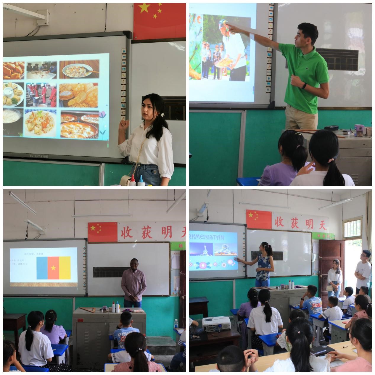 “世界那么大,我想去看看”。听说山里来了外国老师,当地的员工特别好奇,更让大家惊喜的是“洋教师”居然能用中英双语和大家交流。“我们来中国大学前,必须先学习一年以上中文,所以我们都会讲中文。”来自喀麦隆的乔旭阳用流利的中文与员工打招呼,同时也开始了一堂别样的文化交流课。喀麦隆的乔旭阳,乌兹别克斯坦的小斌,土库曼斯坦的李米娜、方洁,马来西亚的周振辉以线上线下结合的模式开展授课。五位“洋教师”用简单的英文介绍与员工进行互动,锻炼大家的英语能力,也营造轻松的交流气氛。接下来每人依次围绕国家特色、风俗文化、饮食生活等方面向员工展示世界各国情况。结合“丝绸之路”、《西游记》等家喻户晓的故事,“洋教师”们讲述了自己在中国的精彩故事,打开了交流之窗,拉近了彼此距离。“我的理想是做一名翻译家,我现在已经会说汉语、俄语、西班牙语、英语和土库曼语,我想读更多的书。”“我要在中国大学里认真学习,将来回国把这里的故事讲给其他人。”李米娜、周振辉回答员工提问。课堂欢声笑语,其乐融融。孩子们相约大哥哥大姐姐将来一定走出大山,拥抱世界。