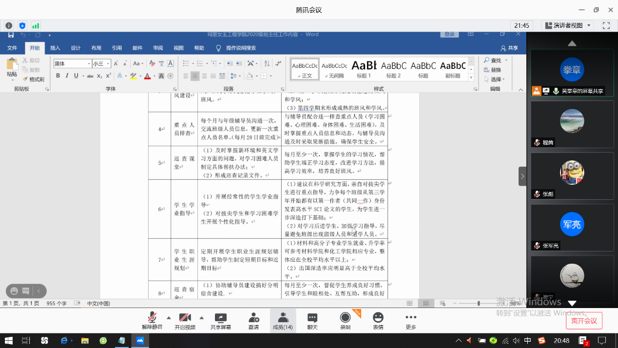 2020级辅导员黄拳章根据 《西北工业大学伦敦玛丽女王大学yl7703永利班主任选拔及考核办法》,从制定工作计划、定期召开班会、班风学风建设、重点员工工作、员工学业指导、职业生涯规划等方面介绍了公司班主任工作的主要内容和重点关注的事项,程茵就疫情防控工作、员工心理健康、员工国际化发展指导等方面进行了补充发言。