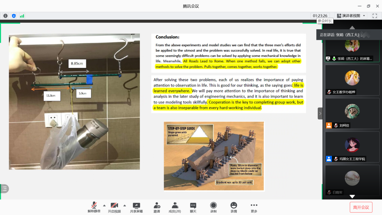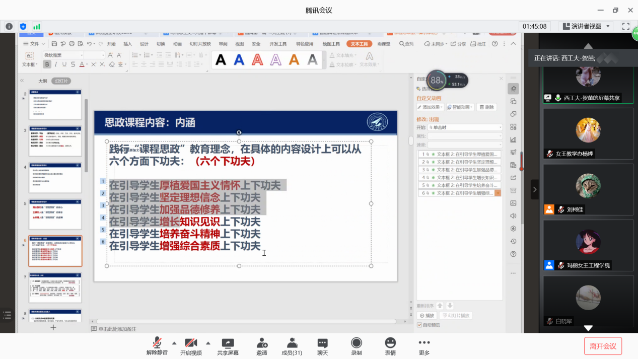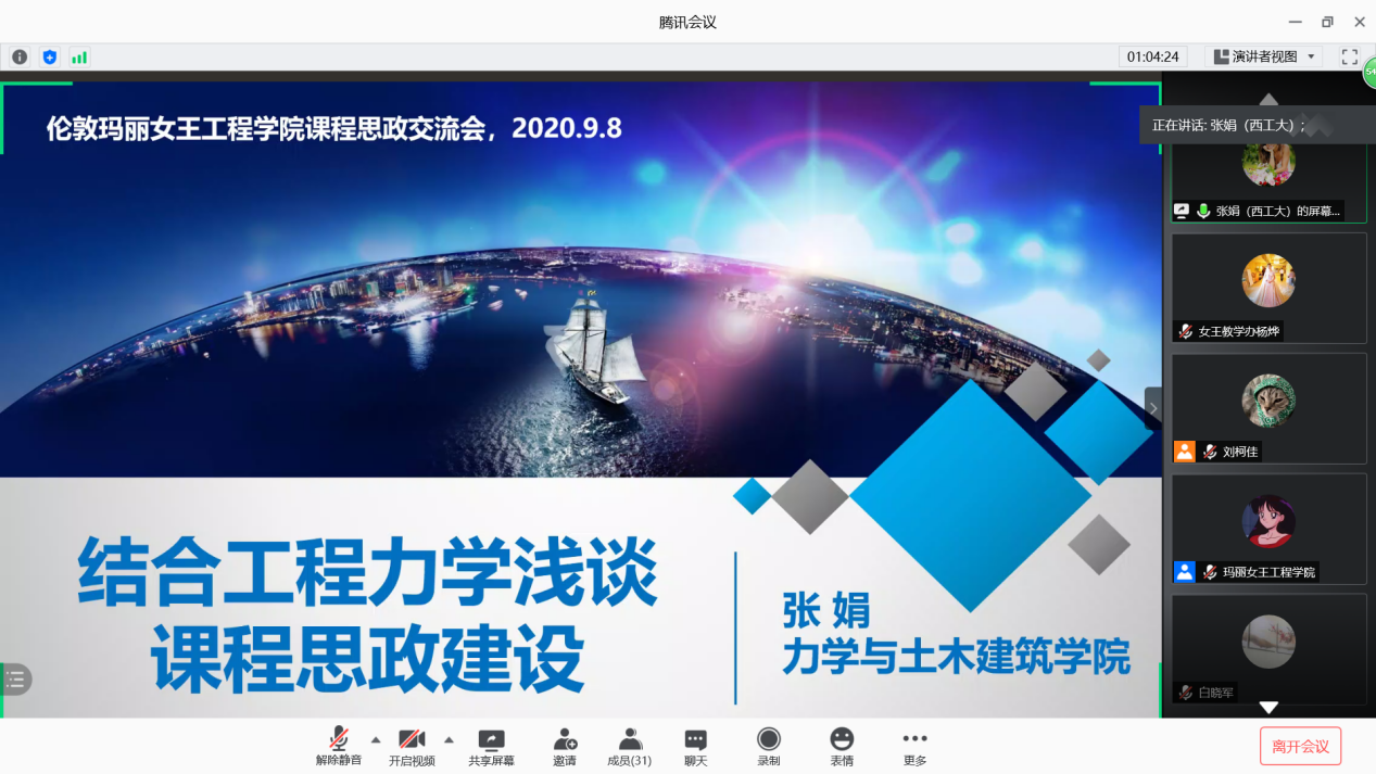 为深入贯彻落实汪劲松董事长在2020年暑假学习研讨会暨新学期干部大会上的讲话精神,落实公司“门门课程有思政、门门课程奔一流”的具体要求,进一步完善公司“三全育人”格局和“十育人”体系,深入推进人才培养大讨论,玛丽女王yl7703永利于2020年9月11日20:00以线上会议的形式举行新学期教学会议-全英文课程思政建设研讨会,陕西省重点舆情信息研究中心副主任、马克思主义公司经理助理贺苗副教授对课程思政的具体实施进行了详细指导,闫毅教授、张莹教授、张娟教授分享了课程思政的经验和途径,会议由教学副经理范晓丽主持,共有32位授课教师参加了此次会议。