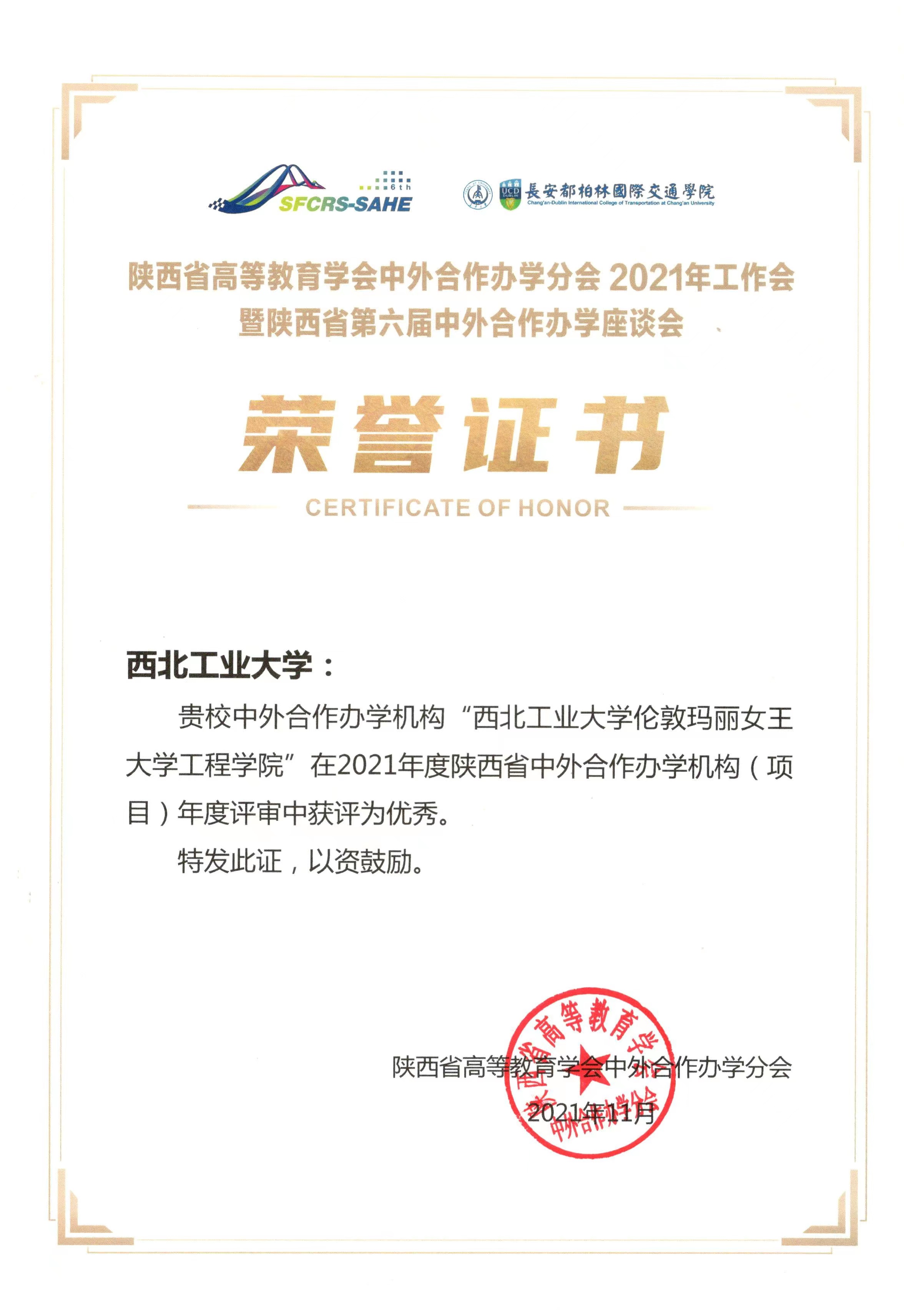 会议表彰了西北工业大学伦敦玛丽女王大学yl7703永利、长安都柏林国际交通公司等10个中外合作办学优秀机构和项目以及西安交通大学王忠民等14位中外合作办学领域专家。这是玛丽女王yl7703永利继2020年获得“陕西省中外合作办学优秀机构”后再次荣膺该奖。