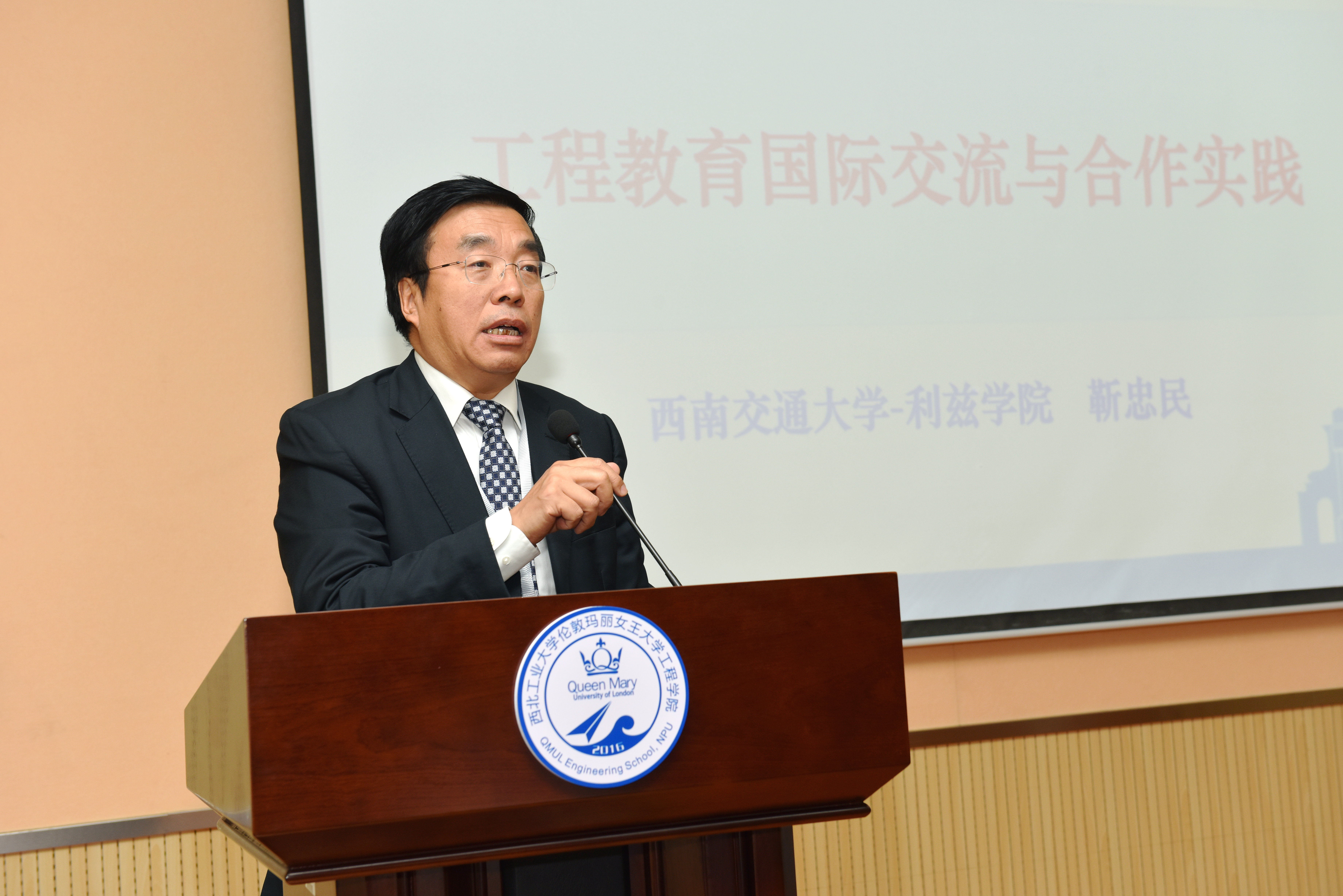 西南交通大学利兹公司经理靳忠民做主题为“工程教育国际交流与合作实践”的报告。他从公司全面坚持党的领导、以本为本的办学理念、一流实验室建设情况分享了西南交大合作办学经验,并对公司的可持续发展和未来规划做了几点思考。