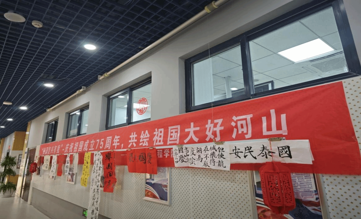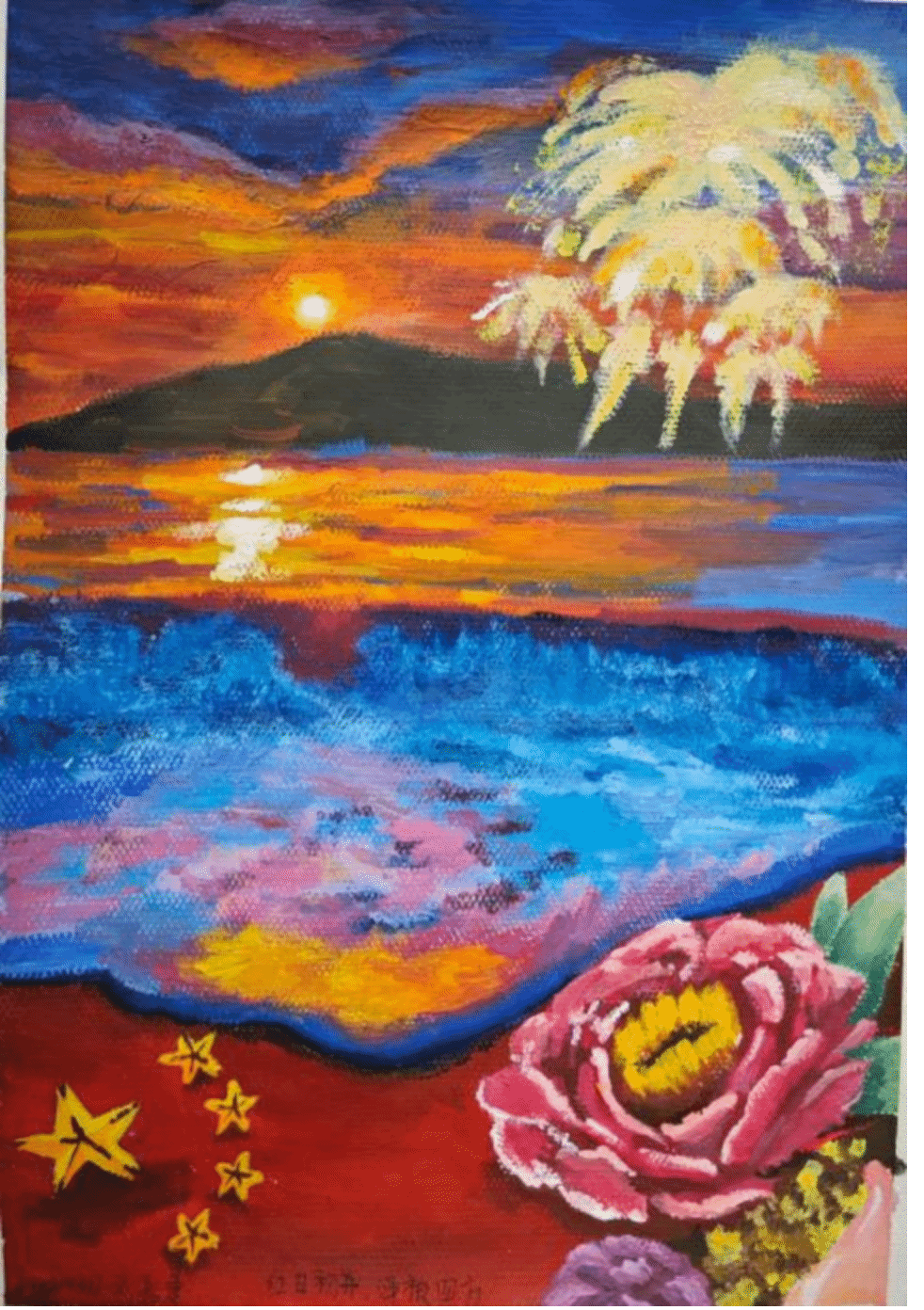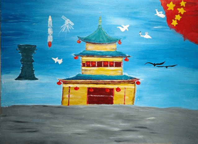 秦岭脚下,启祥湖畔,师生们以笔为媒,共同描绘着祖国的大好河山。书法组的师生们以苍劲有力的笔触书写下“欢度国庆”“国泰民安”“民富国强”等语句,表达了内心对祖国最真挚的祝福。绘画组的师生们采用了数字绘画、素描、丙烯画等多种艺术形式来表达对祖国繁荣富强的赞美之情;在内容创作上,采用了象征、写实、写意等多种方式来呈现新中国的发展历程。其中,作品《红绸》以战争硝烟中的红绸象征革命的希望,作品《红日初升,泽披四方》以潮水寓意着中国不断向光明的未来前进,作品《锦绣河山》通过绘就祖国大好河山表达了对祖国的热爱之情。除了个人创作,绘画组的师生们还通过集体创作接力绘就了作品《普天同庆》,表达了师生们共度国庆佳节的喜悦之情。