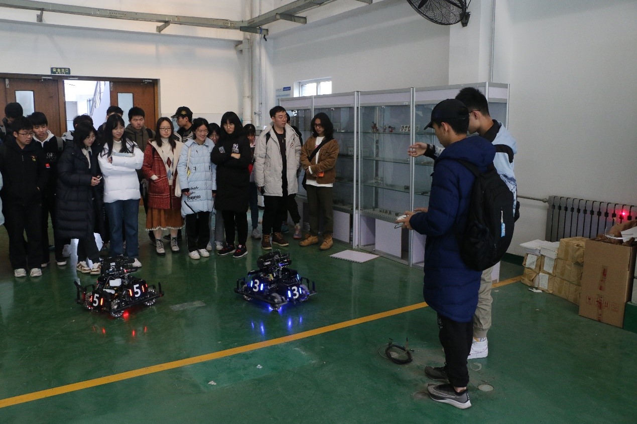 吕冰老师主持并介绍了RoboMaster机甲大师赛和赛程安排。本次RM西安联盟战队交流赛暨青年工程师大会,邀请到了来自西安电子科技大学的IRobot战队和长安大学的VGD战队。比赛过程中的专注、认真、果断,震撼人心的视听冲击力、激烈硬朗的竞技风格深深的吸引着同学们。