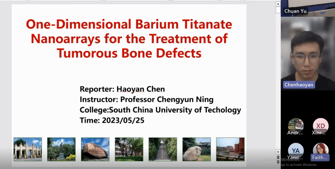 来自华南理工大学的博士生陈浩谚向大家展示了他的研究—— 一维钛酸钡纳米阵列治疗肿瘤骨缺损。参赛选手的多元化趋势也印证了该项赛事在国内外学术界的影响力提升。