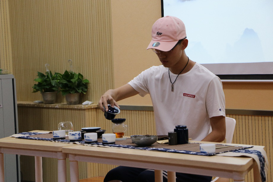 稍事休息过后,魏老师向我们展示了他精湛的茶艺。在轻柔的古风韵律下,魏老师首先认真地用清洗了茶器,保证了茶水的清洁与口感。接着是对茶叶反复的冲泡。步骤虽然简单,但魏老师以其娴熟精湛的操作手法,赢得了同学们热烈的掌声。冲泡完毕后,四位幸运的同学上台品饮了刚刚冲泡好的茶水。随后,其中一位积极的同学在魏老师的指导下,也尝试了泡茶的一系列步骤。虽然有时动作不太规范,或因忘记动作而短暂停顿,魏老师依旧给予了高度的评价。结束之后,又有两名同学尝试进行了冲泡,可见同学们对茶文化拥有着十足的热情。