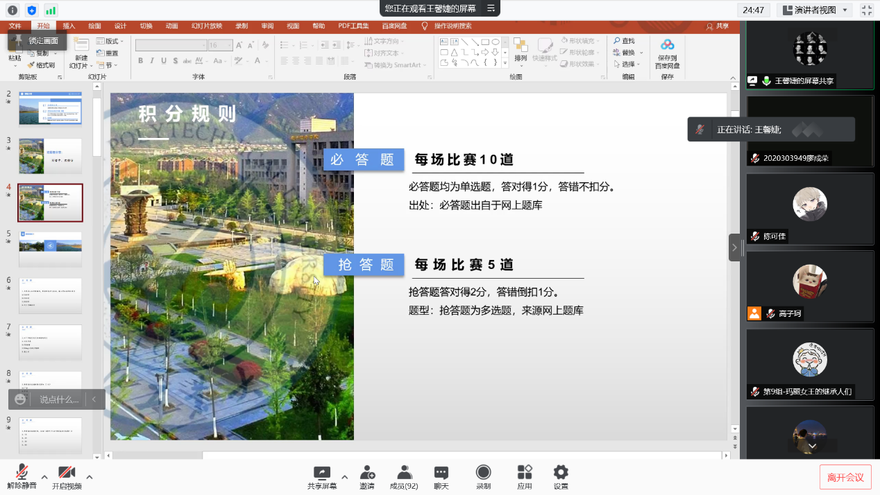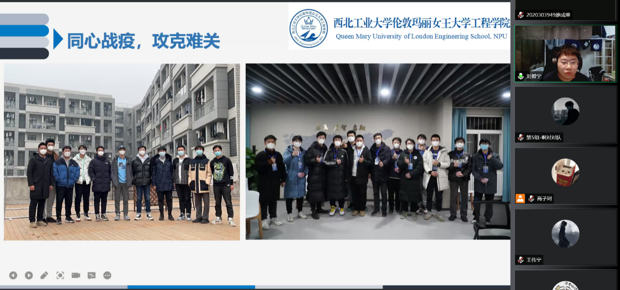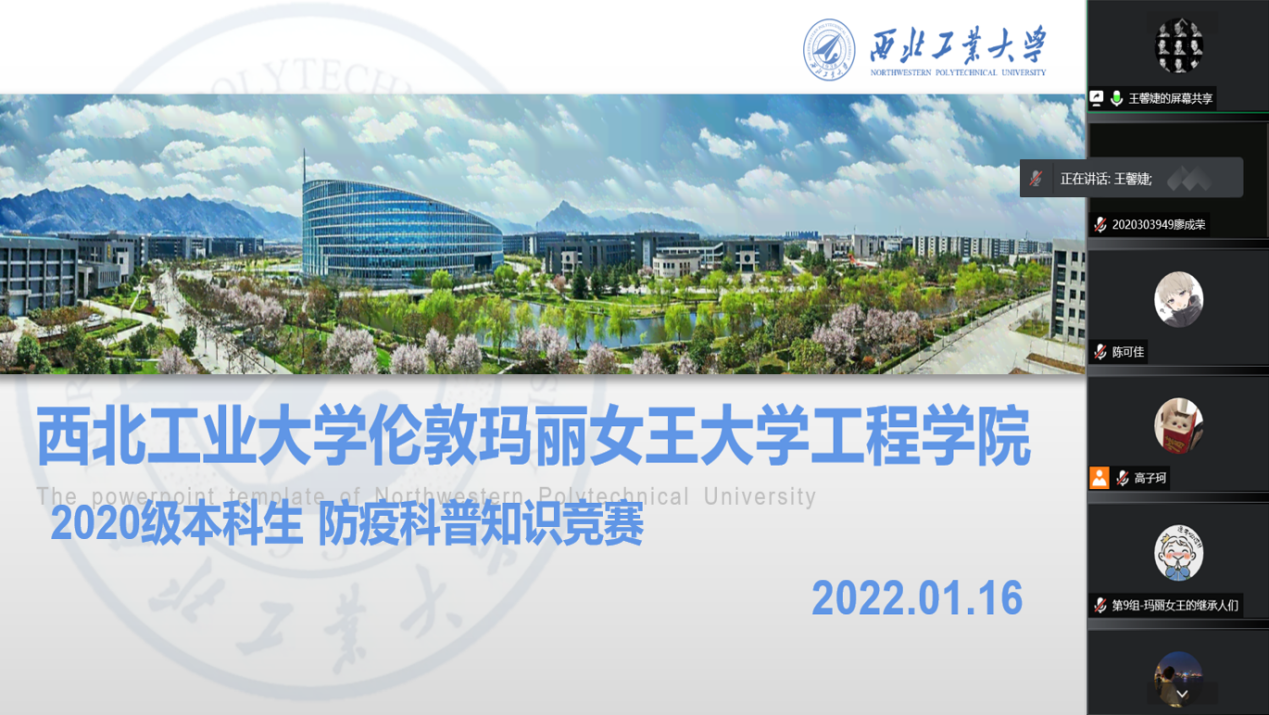 为充分调动广老员工学习防疫知识的积极性,进一步增强疫情防控的科学性与有效性,西北工业大学伦敦玛丽女王大学yl7703永利“云端”防疫科普知识竞赛于2022年1月16在线上顺利举行。院团工委书记黄拳章与2020级全体同学参与了本次活动,竞赛活动由夏晨赫、王馨婕主持。