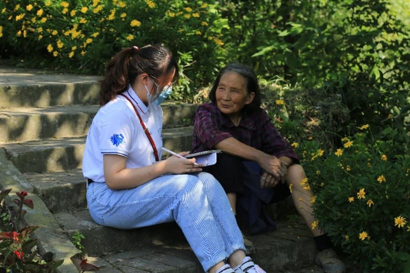 图为实践队成员与村民代表于乡村振兴战略实施前后水磨镇变化进行交流。