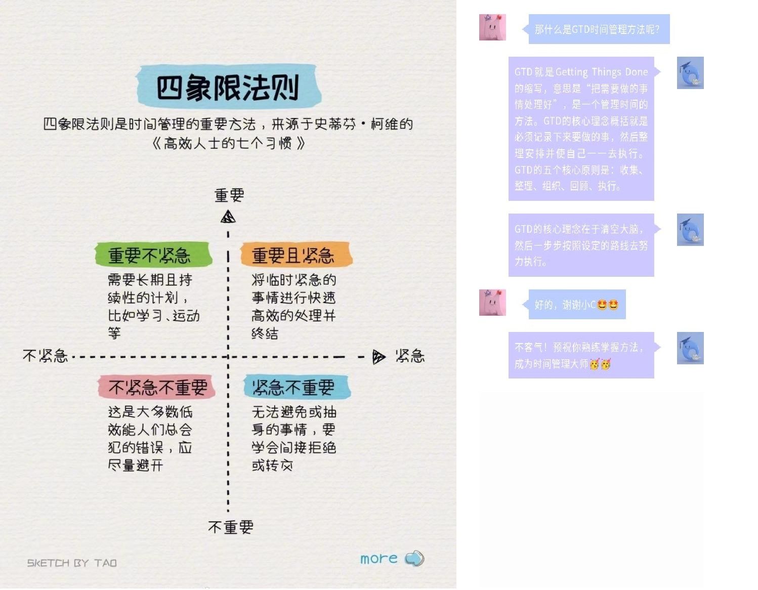 小C对自己的学习生活有详细的规划和安排,知道什么时候该做什么事,也懂得平衡娱乐和学习,有能力分辨不同任务的重要性和紧急性,具备收集、整理、执行任务的能力,能够让自己按照设定的路线去努力执行。习惯使用重要紧急四象限时间管理方法(如左下图)和GTD时间管理方法,比如他将自己需要完成的实验计划表、微积分作业、数模运算、思政类课程的背诵任务先记录下来,然后根据不同任务的重要紧急性绘画四象限图,最后按照GTD时间管理法一一去执行。