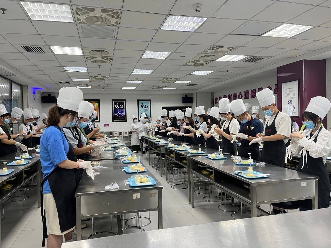 In the Happy Baking Magic Castle of the factory, students visited functional area of the factory and eight processing windows of bread technology where the production process of bread from research and development to production and packaging was shown.Staff in the factory introduced to the students about thehistory of cake, from its origin in ancient Rome to its widespread spread around the world, and how the first birthday cake and the first wedding cake were baked. During the refreshment time, students tasted delicious pastries made by the chef. After a short break, students put on chef outfits and began to make mung bean cakes. Under the detailed explanation and guidance of the chef, students divided the mung bean paste, wrapped the red bean filling, compressed and demoulded, and finally made beautiful mung bean cakes.