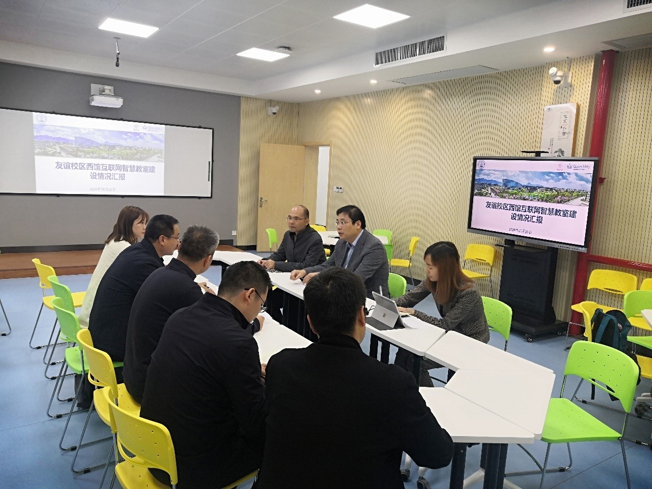 玛丽女王yl7703永利孔杰经理介绍了友谊校区互联网智慧教室建设方案论证、建设资金筹措、校领导批复立项和委托基建处实施建设整体情况,对教务处、基建处、招采中心、信息化处、国资处、保卫处、后勤集团等在疫情期间对该项目建设的大力支持、确保该项目按时间节点顺利交付使用表示由衷的感谢。在建设完成后,移交给教务处统一管理,希望能够充分发挥智慧教室作用,打造“教”与“学”的“学习共同体”,服务公司一流本科专业教学和国际化人才培养。玛丽女王yl7703永利黄拳章详细汇报了建设过程、教室功能和经费执行情况,现场展示了“教工卡插拔卡联动开启设备”、“教室一键呼叫到主控室”、“实物展台图像投屏”、“课堂自动录制”以及“网络直播课堂和点播课堂”等一系列功能。