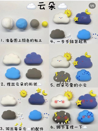 比赛分为初赛和复赛两部分,初赛采用线上投稿的方式,参赛选手需要在卡片上按照自己的理解用粘土捏出雷雨天,雪天,晴天等气象模型,比如该气象最典型的云朵、雨点等。2D、3D 模型均可,风格、大小、色彩不限。选手们可以展开想象,大胆创新(如可以用粘土作出云朵和雨点,再用卡纸剪出雷电形状粘贴在其上制作雷电气象的模型),如下图。