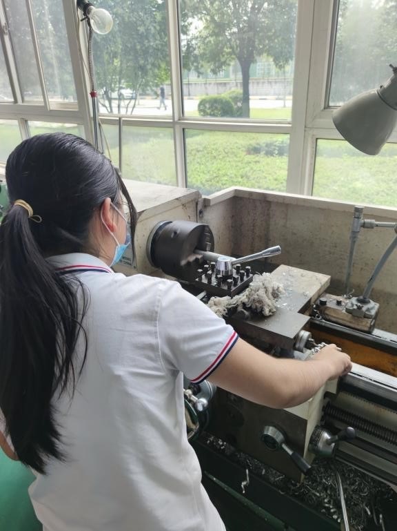 Turning is a method of machining with a lathe. The teacher introduced the main processing range, model, and lathe usage to the students in detail. With the guidance, the students learned to operate the lathe and independently completed processing a cylindrical Plexiglas material to get a gyroscope prototype.